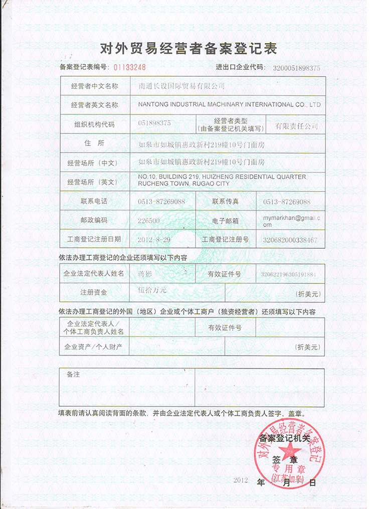 NANTONG INDUSTRIAL MACHINARY CO., LTD