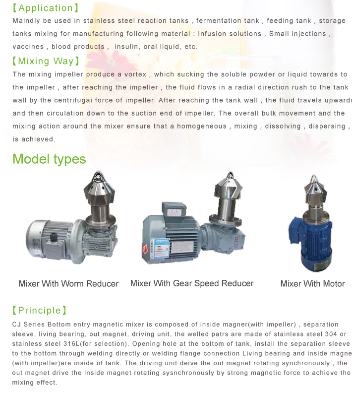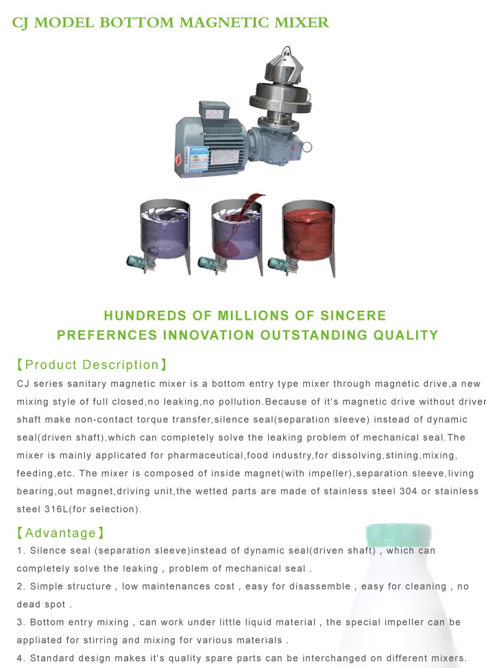Using the repulsion between the different poles of the magnetic material,we dricve the magnetc agitator by continuous changing the polarity of the magnetc base. Magnetc agitator from Zhejiang L&B is mainly GMP remoulded and designed for pharmaceutical, biotechnology and food industry. Excellent performance, reasonable structure, small size, reliable use. Magnetc agitator compose of inner magnet and outer magnet, isolated sets, motor and other components,it is suitable for a variety of stainless steel reaction tanks.Magnetic agitator from Zhejiang L&B are made from stainless steel 316L/304, it works by the working principle of permanent magnetic coupling ,to drive agitator shaft run. Welded static seal instead of dynamic mechanical seals, completely solved the drawbacks of mechanical seal which will be leaked.
