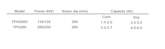 · В основном используется для экструдирования соевой муки, кукурузы, соевого шрота и хлопьевидного корма для маленьких поросят в комбикормовой промышленности, а также для обработки других материалов.